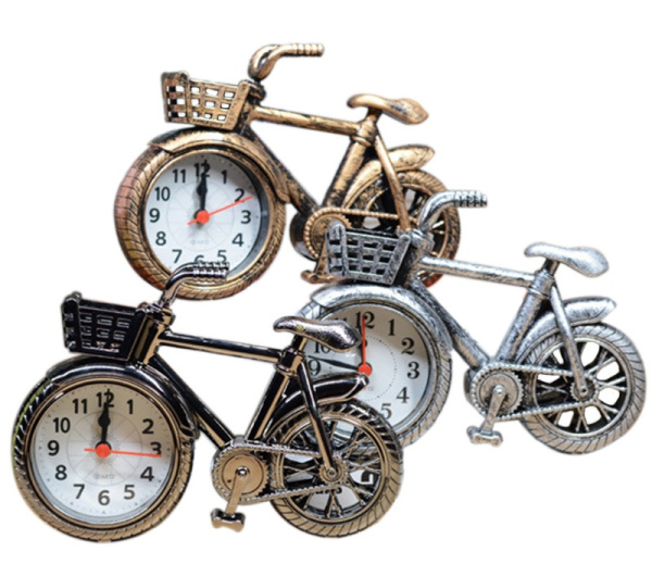 Часы в стиле ретро «велосипед с корзиной». Материал: пластик, стекло. С кварцевым механизмом с дискретным ходом стрелок. Контрастный циферблат с арабскими цифрами. Форма фигурная. Цвет хромированный.