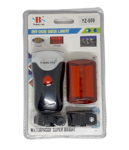 Фонарь велосипедный + стоп-сигнал YZ-809. Передняя фара имеет 3 режима работы: яркий, экономичный, сигнальный. Крепится на руль с помощью универсального крепления зажима. Задний красный фонарь имеет 7 режимов работы: 1 режим яркий и 6 мигающих. Крепится на трубу под сидением с помощью универсального зажима. Фонарь вставляется в полозья зажима и защелкивается. Тип диода: LED. Диод переднего фонарика: COB. Количество диодов задней фары- 5. Питание переднего фонарика: 3 AAA батарейки. Питание задней фары: 2 AAA батарейки. Комплектация: передний фонарь; задний фонарь "стоп"; крепление к велосипеду.