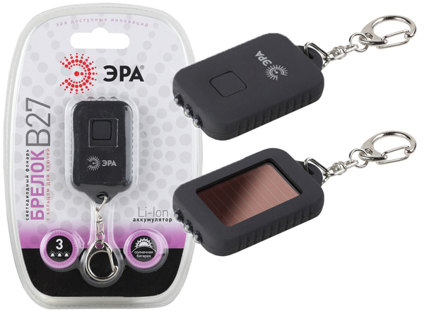 Фонарь-брелок B27 имеет интересную особенность - на нём установлена солнечная батарейка. Этот мини фонарик оснащён тремя яркими светодиодами, долговечными и энергоёмкими. Светодиоды светят белым светом, дальность луча составляет 21 метр. Брелок портативный, выглядит стильно и его приятно держать в руках. Прорезиненный корпус защищает фонарик от случайных падений, а также не скользит в руке.