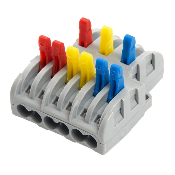 Монтажные клеммы разветвитель с 3 входами и 6 выходами предназначены для многоразового соединения проводников в диапазоне от 0,08 до 4ммкв. Пружинные зажимы коннекторов обеспечивают надежный контакт. Особенностью коннекторов является надежная защита от контакта с токоведущими частями. Материал корпуса – полиамид 6.6. Материал клемм – медь и нержавеющая сталь. Применяются для подключения осветительного оборудования и в распаячных коробах. Количество зажимаемых проводов-6.