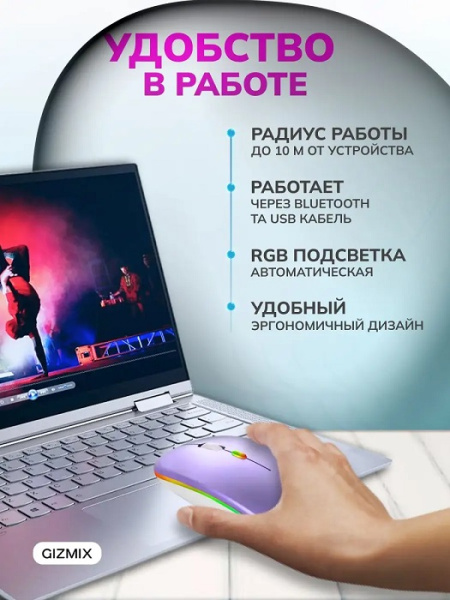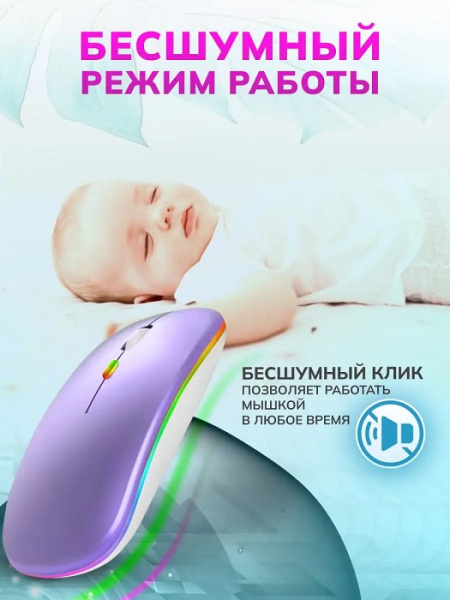 Беспроводная мышь с LED подсветкой и индикатором зарядки для компьютера, ноутбука и пк. Работает от встроенного аккумулятора до 168 часов. Компьютерная мышь бесшумная, с подсветкой, в процессе работы меняет цвет, приятный для глаз, может служить как мышка игровая. В комплект входит usb-кабель, с помощью которого можно зарядить мышь от компьютера или ноутбука, сетевого зарядника или повербанка.