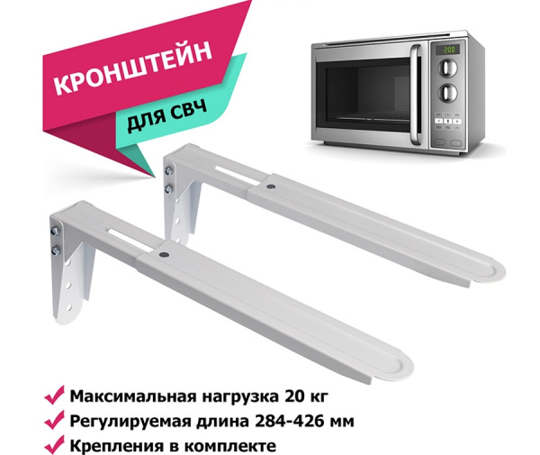 Настенный кронштейн для СВЧ печей. Полка для микроволновки. Крепление СВЧ выдерживает максимальную нагрузку до 20 кг. Вылет от стены 284-426 мм. Расстояние между опорами может быть установлено по вашему усмотрению. Это позволяет использовать данные крепления не только для микроволновых печей, но и для размещения различных устройств, например, принтеров, факсов, A/V систем и других предметов, вес и габариты которых превышают предельно допустимые для кронштейнов со стеклянными полками.Регулировка по длине, крепеж в комплекте.