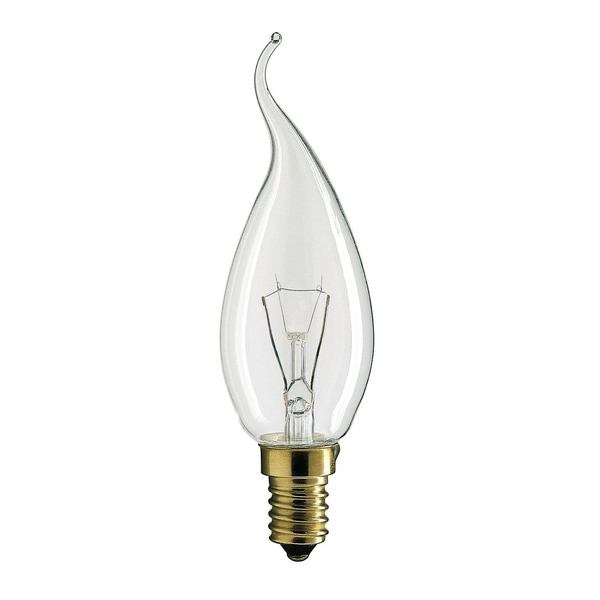 Лампа накаливания DECOR С35 FLAME CL 40W E14 мощностью 40 Вт, с колбой, форма которой напоминает колеблющуюся на ветру свечу, великолепно дополняет люстры и светильники, подчеркивая их утонченность и стиль, может использоваться без плафонов и абажуров ввиду ее грациозности.