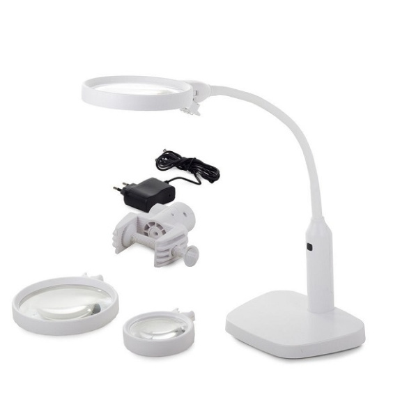 Лупа настольная с подсветкой со сменными линзами для ювелиров, нумизматов, электроники, часовщиков, мастеров маникюра и др. Имеет 2 сменные линзы: - диаметр линзы -120мм, увеличение - 2х; -диаметр линзы -75мм, увеличение -5х. Подсветка -6 суперярких светодиодов. Режимы яркости: яркий, тусклый. Материал корпуса: металл, пластик. Материал линзы: стекло. Фокусное расстояние: 290мм, 115мм. Область применения: чтение, рукоделие, вышивание, радиотехнические и ювелирные работы, часовые работы. Комплектация: -гибкий штатив с подсветкой; -большая линза - 120мм; -маленькая линза - 75мм; -подставка; -струбцина; -зарядное устройство.