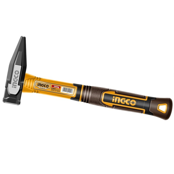 Слесарный молоток с фибергласовой ручкой является простым и незаменимым ручным инструментом, который применяется для забивания гвоздей. Состоит из стального бойка комбинированной формы и фибергласовой рукоятки. Боек прошел процесс закалки, для увеличения твердости. Благодаря фибергласу рукоять поглащает вибрацию при ударе. Вес бойка: 300 г.