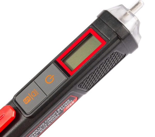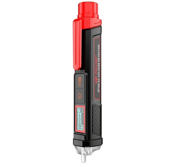 Детектор переменного напряжения с возможностью определения фазной и нулевой жилы, ЖК-дисплеем, световым и звуковым индикатором. Два диапазона чувствительности: высокий: 12–1000 В/ низкий: 70–1000 В, ЖК-дисплей со шкалой интенсивности. Индикация интенсивности сигнала: звуковая: сигнал от медленного к быстрому, световая: от зеленого к красному, шкала: от низкой до высокой, цифровая: от низких значений к высоким.