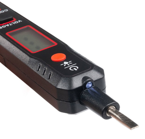 Отвертка-индикатор с возможностью определения наличия переменного напряжения, определения провода фазы, проверки целостности электрических цепей, величины переменного тока. Контактный и бесконтактный методы определения напряжения, диапазон чувствительности: 12-300 В, жк-дисплей с указанием величины измеряемого переменного тока. Индикация интенсивности сигнала: звуковая (3 уровня) и световая (2 цвета).