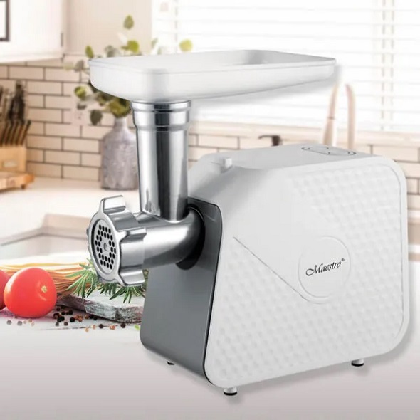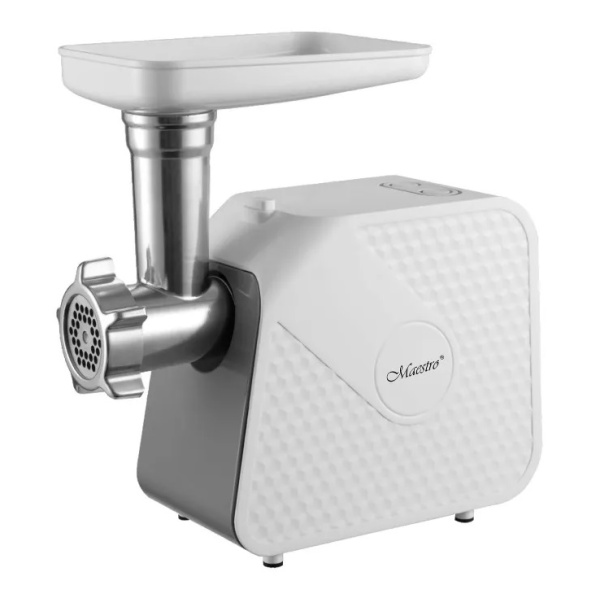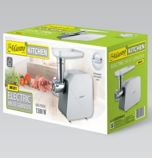 Мясорубка Maestro MR-851 - незаменимый инструмент для любителей мясных блюд. Ультрасовременный дизайн и легкость в использовании. Современный дизайн. Мощный мотор. Обработка мяса, рыбы, овощей. Функция Реверс.Насадка для изготовления томатного сока. Насадка для изготовления колбас. 3 Насадки для измельчения, нарезки и шинковки. Два вида дисков для измельчения. Крестообразный нож из высококачественной стали. Пластиковый лоток для продуктов. Толкатель. Максимальная мощность 220-240 В, 50 Гц, 1500 Вт.