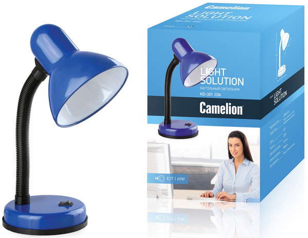 Настольный светильник, синий Camelion KD-301, 5752 используется для освещения рабочего места в офисе или письменного стола дома. Изготовлен из прочного металла. Конструкция корпуса пружинная, что позволяет регулировать высоту и положение плафона. Стандартный цоколь Е27 используется как с лампами накаливания, так и с энергосберегающими и светодиодными лампами.Длина шнура 1,6 м. Размеры,мм: 130х140х200.