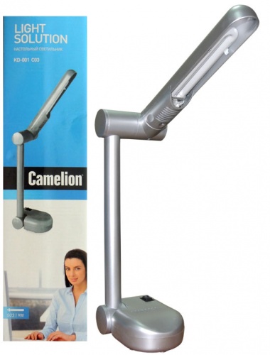 Настольный светильник, серебро Camelion, KD-001, 3287 используется для дополнительного освещения рабочего стола в офисе или дома. Изготовлен из термостойкого пластика серебристого цвета. Светильник оснащен выключателем, расположенным на подставке. Цоколь G23 используется с энергосберегающей лампой LH9-U (входит в комплект).Длина сетевого шнура: 1.6 метр.