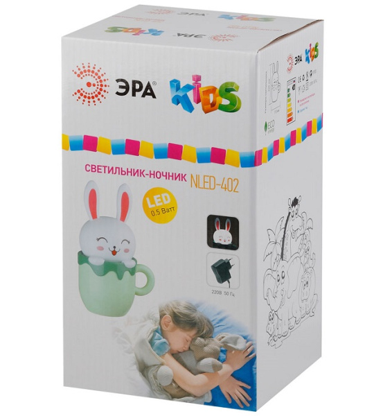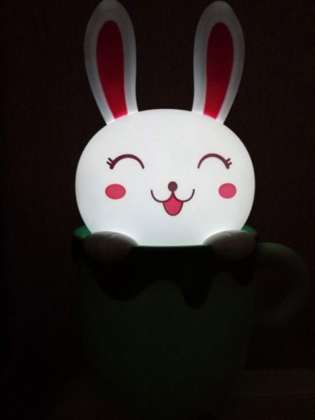 Светильник-ночник со светодиодами (LED) в качестве источников света. Встроенный аккумулятор для автономной работы. Сетевой адаптер в комплекте. Светильник работает во время зарядки от сети. Детский дизайн в виде зайца. Удобная ручка для переноски.