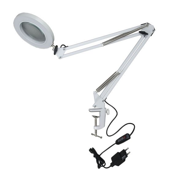 Настольный светодиодный диммируемый светильник с увеличительным стеклом 5-ти кратное увеличение и удобное управление, делают данный светильник незаменимым помощником для занятий любимыми хобби. Мощность светильника 8 Вт. Смена цветовой температуры от теплый белого света (2700К) до дневного белого света (5500К). Механический выключатель на проводе. Световой поток 300 Лм. Захват металлической струбцины 5,5 см.