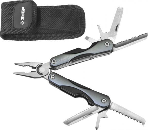 Нож, пила по дереву, напильник, плоскогубцы, отвертка sl, серрейторный нож, отвертка ph, кусачки, захват для гаек и цилиндров, чехол.