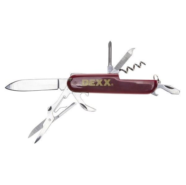 нож, открывалка для консервных банок, ножницы, напильник, штопор, отвертка sl, пинцет, зубочистка, кольцо для ключей, открывалка для бутылок, отвертка ph.