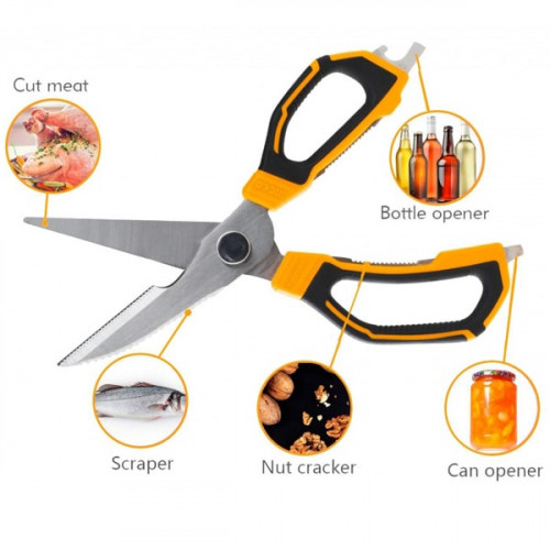 Ножницы 225 мм незаменимый многофункциональный инструмент на вашей кухне, который подойдет для разрезания различных продуктов, чистки рыбы, открывания банок и бутылок, а также колки орехов. Лезвие выполнено из прочной нержавеющей стали. Толщина лезвий - 3 мм. Длина инструмента -225 мм.