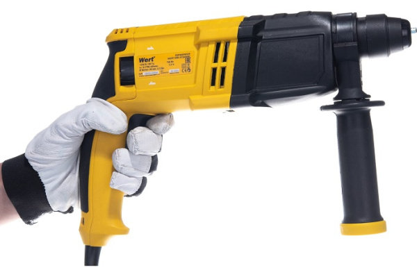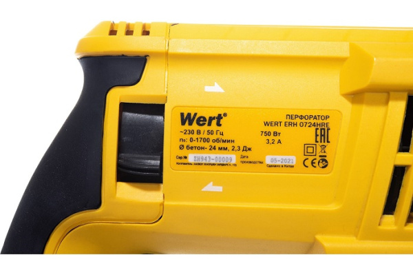 Перфоратор Wert ERH 0724HRE – легкий и компактный инструмент, предназначенный для долбления и сверления бетона, кирпича, камня, дерева, металла и других материалов. Незаменим для решения бытовых и строительных задач, связанных с проделыванием отверстий небольшого диаметра. Работает от сети, оснащен двигателем с горизонтальным расположением мощностью 750 Вт. Корпус изделия изготовлен из качественного пластика. Рукоятки агрегата прорезинены, благодаря чему они не скользят и инструмент удобно удерживать во время работы. Дополнительная рукоять вращается относительно двух сторон. Работает в 3х режимах: сверления и бурения с ударом (максимальная энергия – 2,3 Дж), долбления (отбойный молоток), сверления без удара. Патрон SDS plus легко устанавливается и позволяет использовать большой спектр оснастки. Ограничитель глубины используется для сверления отверстий заданной глубины. Предохранительная муфта предотвратит поломку двигателя от перегрузки при достижении высокого крутящего момента.
