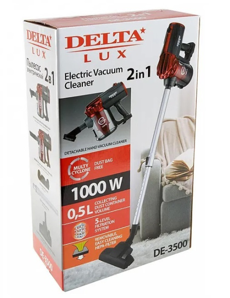 Сбор мусора осуществляется в пластиковый контейнер, обладающий емкостью 0.5 л. В наборе поставляются универсальная двухрежимная насадка для пола/ковров, а также сменные насадки для уборки мебели и труднодоступных мест. Из других особенностей Delta Lux DE-3500 отмечаются телескопическая труба всасывания, технология защиты от перегрева, настенное крепление.