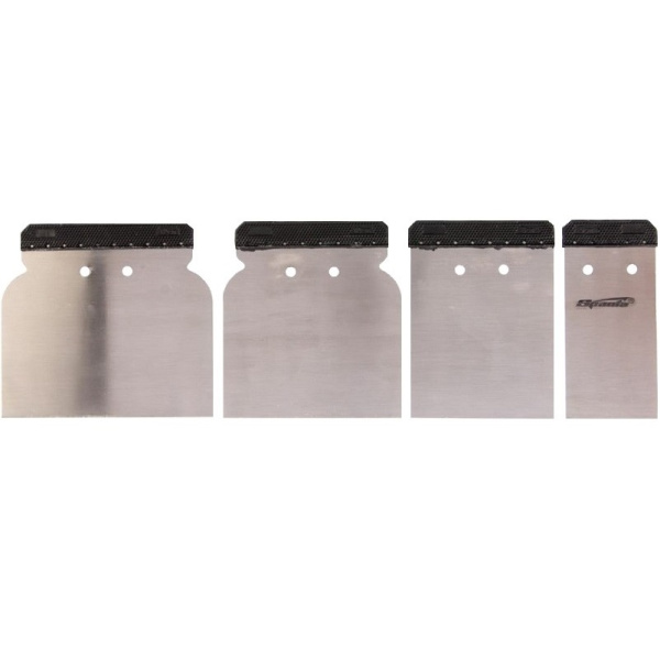 Набор включает 4 стальных шпателя японского типа размером 50, 80, 100 и 120 мм. Он используется для нанесения выравнивающих и защитных покрытий на подготовленные поверхности. Специальные держатели обеспечивают отличный контроль нанесения штукатурки и других материалов.