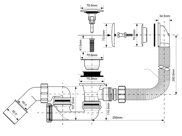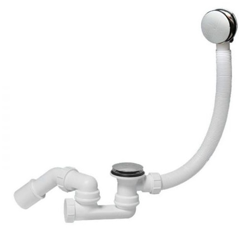 Слив-перелив для ванны, MRB8CB(1 1/2"х40мм) переливом (L500ммхD34мм), металлическими 70мм сливной решеткой и пробкой тип-"кнопка"; выход Дн=40/50мм; цвет-хром.