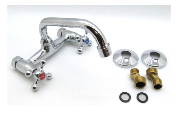 Настенный смеситель F4708 Хром, оснащён двумя рычагами для контроля напора горячей и холодной воды. Аэратор в приборе помогает обеспечить равномерную подачу воды и ее относительноесмягчение. Сетка внутри устройства отфильтровывает примеси. Монтируется на стене с целью подключения подводки из стены. представленная модель выполнена в классическом стиле.