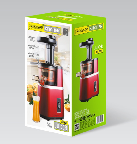 Шнековая соковыжималка MR-808 slow juiser Maestro. Применение технологии «медленного отжима» и функции "реверс", в отличие от обычных соковыжималок не требует измельчения и превращения овощей и фруктов в пюре, обеспечивая максимальное сохранение вкуса, аромата, витаминов и микроэлементов овощей и фруктов. Система «капля стоп» предотвращает вытекание капель сока, когда требуется перерыв в работе. Система защиты от включения в случае неправильной сборки изделия. Минимальный шум и уровень вибраций при работе. Приготовление сока из твердых и мягких продуктов. Прорезиненные ножки гарантируют надежное закрепление прибора и безопасность во время использования.