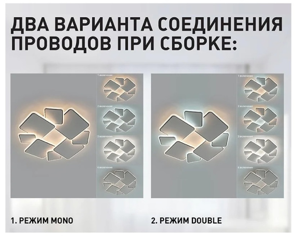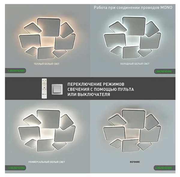 Управляемый настенно-потолочный светодиодный светильник УУО00005123 с пультом (ДПУ). Регулировка яркости от 10 до 100%, изменение цвета свечения от теплого до холодного, функция ночник (10% света), управление с выключателя (теплый, холодный, нейтральный, ночник). Можно при сборке выбрать вариант DOUBLE при подключении проводов, тогда в светильнике одновремнно будут и холодный и теплый свет. Эффект DOUDLE можно посмотреть на фото в карточке товара на сайте.