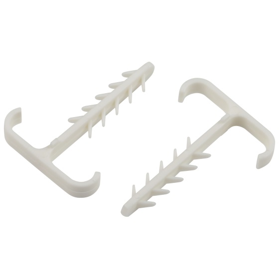 Дюбель-хомуты Т-образные предназначены для крепления плоских проводников к кирпичным и бетонным стенам, а также стенам, выполненным из пеноблоков и природного камня. Изделия сочетают в себе сразу два элемента: дюбель и скобу, что позволяет проложить 2 кабеля одновременно как вертикально, так и горизонтально. Одинаково эффективны при прокладке кабеля в кирпичных и блочных стенах, бетонных перекрытиях, потолках, полах и фундаментах.