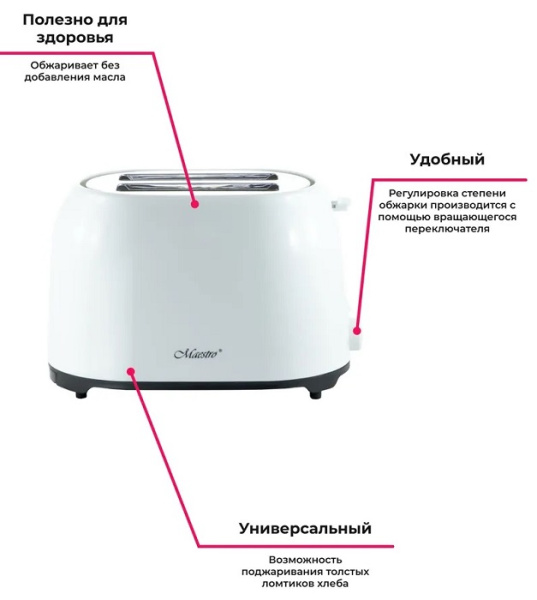 Тостер MR-702 - идеальный помощник для каждой кухни. Он быстро подготовит пару хрустящих, ароматных ломтиков хлеба. Вы сможете экспериментировать с режимами приготовления, выбирать новые варианты и тестировать необычные вкусы готовых сэндвичей. Поддон для крошек съемный - после завершения работы снимите его, помойте - больше ничего делать не нужно. Если в процессе работы тостера вы решите, что хлеб готов, просто остановите цикл, нажав на соответствующую кнопку. Мощность: 750 Вт. Возможность поджаривания толстых ломтиков хлеба. Открывающийся поддон для крошек. 6 уровней поджарки хлеба. Параметры питания: 220-240В, 50 Гц. Материал корпуса: пластик.