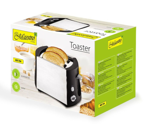 Компактный и многофункциональный прибор Maestro MR704 за короткое время поджарит хрустящие ломтики хлеба, приготовит прекрасные тосты и подогреет круассаны или булочки. Имеется съемный поддон для сбора крошек и упростит уход за прибором, а не нагревающийся корпус защитит от случайного ожога. Имеется термостат на 6 степеней обжарки. Возможность поджаривания толстых ломтиков хлеба. Удобная кнопка отключения.