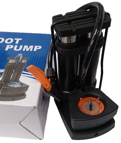 Насос двухцилиндровый с манометром (ножной), для надувания как велосипедных, так и автомобильных клапанов.