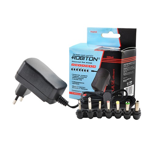 Импульсный адаптер/блок питания 500мА TN500S. Очень легкий и компактный соответствует последним стандартам: сниженное энергопотребление и высокий КПД, 7 сменных штекеров, подходящих к 98% электроприборов! Стабилизированное напряжение, защита от короткого замыкания и перегрузок.
