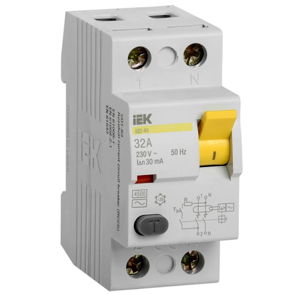Дифференциальный выключатель ВД1-63 (УЗО) 2Р 30мА. Быстродействующий защитный выключатель, реагирующий на дифференциальный ток, без встроенной защиты от сверхтоков. Предназначен для защиты человека от поражения электрическим током при случайном непреднамеренном прикосновении к токоведущим частям электроустановок и предотвращает возникновение пожаров вследствие протекания токов утечки на землю. Не имеет собственного потребления электроэнергии и обладает высокой механической износостойкостью.