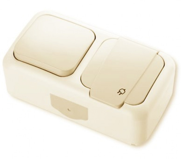 Горизонтальный блок розетка с заземлением + выключатель 1-клавишный наружной установки серии Palmiye от VIKO предназначен для работы в сетях переменного тока до 250 В, объединяет силовую точку и управление освещением. Такая конструкция позволяет рационально организовать электроснабжение жилого или офисного пространства. Корпус изделия выполнено из качественного и прочного пластика кремового цвета. Контактные группы изготовлены из латуни. Устройство объединяет розетку c заземляющим контактом и одноклавишный выключатель. Розетка оснащена крышкой. Номинальный ток: розетка - 16A, выключатель - 10A. Блок горизонтального исполнения предназначен для наружного монтажа.