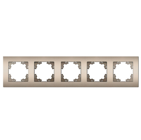 Рамка пятиместная шампань А1042-Br обладает классическим дизайном, служит для оформления розеток и включателей. Придает электротехническим устройствам завершенный вид.