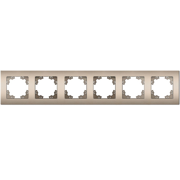 Рамка шестиместная шампань А1043-Br  обладает классическим дизайном, служит для оформления розеток и включателей. Придает электротехническим устройствам завершенный вид.