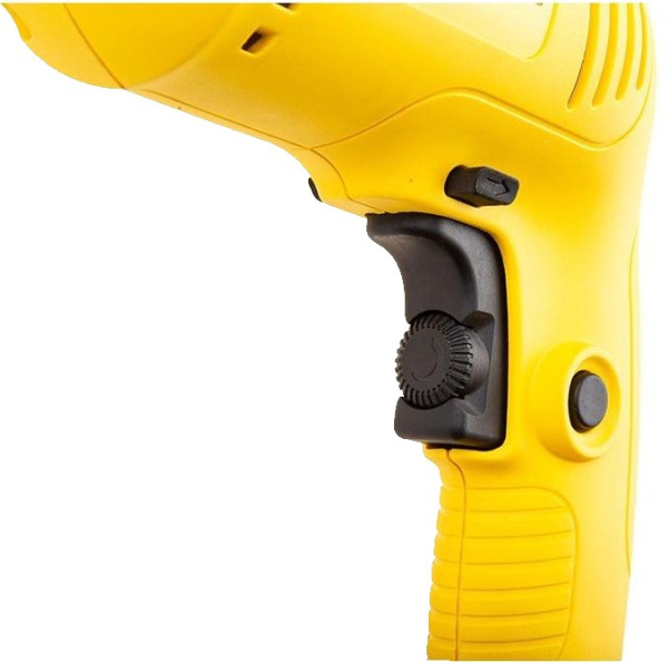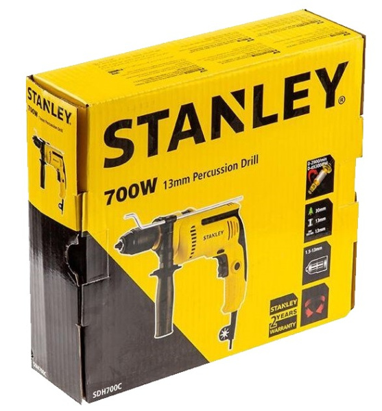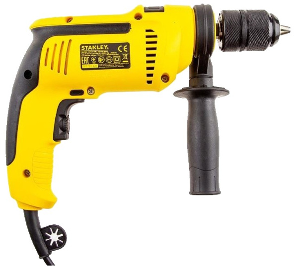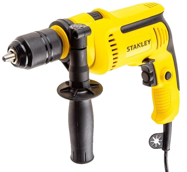 Ударная дрель Stanley SDH700C снабжена быстрозажимным патроном, благодаря чему смена оснастки не занимает много времени. В зависимости от плотности материала можно подобрать нужную скорость работы с помощью регулировочного колесика на пусковой кнопке. Предусмотрена функция реверса, которая помогает извлечь сверло при заклинивании. В комплект входит глубиномер, при помощи которого оператор визуально отслеживает длину высверливаемого канала.