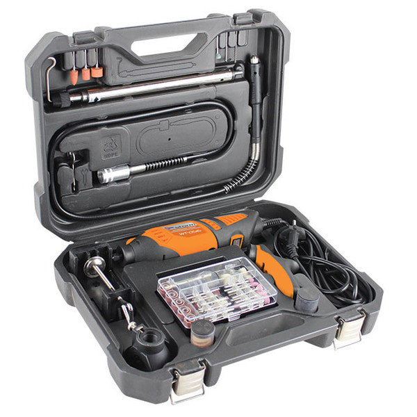 Электрический гравер EE 160 с гибким валом 150301160 предназначен для выполнения широкого спектра работ, таких как: резка, полирование, гравирование, шлифование и зачистка. Он обладает надежным электродвигателем и эффективной системой охлаждения, что обеспечивает качественный результат. Электронная регулировка частоты вращения позволяет оптимально настроить инструмент на работу с различными материалами. Благодаря функции блокировки шпинделя можно легко и быстро заменить оснастку.