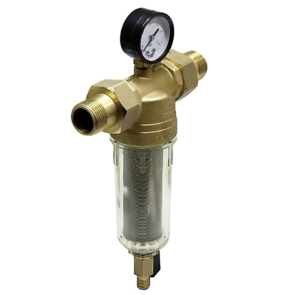 Фильтр 1/2" TIM в СТЕКЛЯННОМ корпусе для холодной воды самоочищающийся с манометром 0-6 бар, с американками и сливным краном. Для систем водоснабжения и отопления. Предназначен для холодной и горячей воды/теплоносителя. Материал чаши фильтра: стекло. Материал фильтрующего элемента: нержавеющая сталь. Устройства имеют простую и надежную конструкцию, легко устанавливаются, эффективно задерживают механические примеси. Фильтрующий картридж 100 мкр. Установка этого фильтра защитит Вашу сантехнику и бытовую технику, имеющую подключение к водопроводу от возможной поломки в следствии попадания внутрь прибора песка, окалины и прочего мусора. По показанию манометра определяется степень загрязнения фильтра. Скопившаяся в фильтре грязь через сливной вентиль смывается в канализацию.