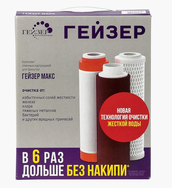Комплект картриджей Макс №17 50091 включает три модуля: композитный AQUASOFT, содержащий ионообменную смолу для устранения солей жесткости, «Арагон» для качественного очищения жесткой воды, CBC с кокосовым углем для удержания хлора. Обработанную жидкость можно использовать с бытовыми устройствами (чайниками, утюгами, парогенераторами) и сантехникой, поскольку она не способствует образованию накипи и ржавчины. Ресурс составляет 9000 л, по истечении которого необходимо заменять блоки. Картриджи совместимы с трехступенчатыми стационарными фильтрами ГЕЙЗЕР и оптимально подходят для установки в системы других производителей стандарта 10SL.