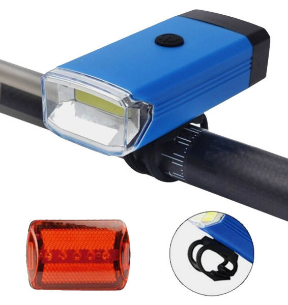 Фонарь велосипедный передний + задний YZ-873. Комплект вело фонарей который включает в себя яркую с хорошим светом переднюю фронтальную фару с мощностью диода 5 W серии COB и заднего стоп-фонаря красного свечения для обозначения габаритов вашего транспортного средства на дороге. Фары из набора работают от самых обычных, и повсеместно доступных мини пальчиковых батареек количеством 3 штуки.