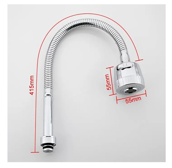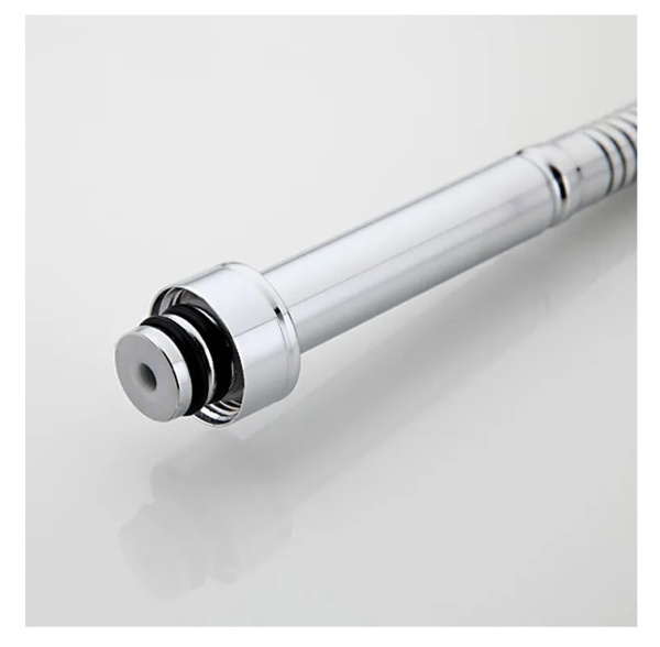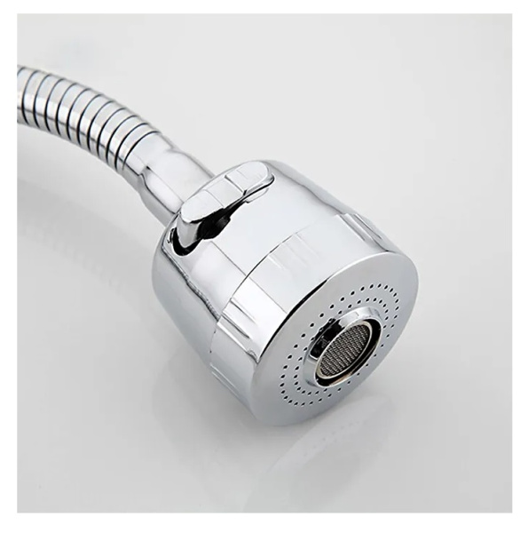 Рефлекторный излив F7310 с гибким шлангом сделан из латуни и покрыт хромом. Лучше всего подойдет для установки на кухню, так как на гусаке имеется насадка для душа и получается, что доступно два режима — стандартный поток и душ. Удобно будет мыть посуду, овощи или фрукты. Корпус из латуни не лопнет под напором воды, не поржавеет и не потеряет блеск со временем.