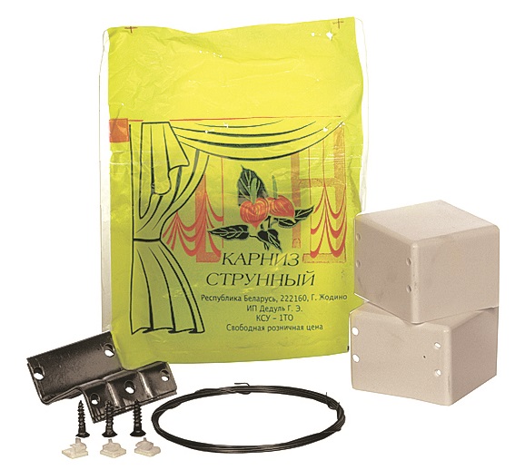 Карниз – струна 1/75. Возможен скрытый монтаж. В этом случае карниз стоит устанавливать в помещениях с натяжными и подвесными потолками, которые надежно скроют из вида карниз. Зажимов в комплекте нет.