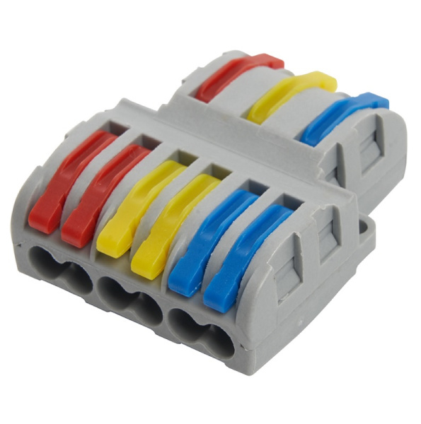 Монтажные клеммы разветвитель с 3 входами и 6 выходами предназначены для многоразового соединения проводников в диапазоне от 0,08 до 4ммкв. Пружинные зажимы коннекторов обеспечивают надежный контакт. Особенностью коннекторов является надежная защита от контакта с токоведущими частями. Материал корпуса – полиамид 6.6. Материал клемм – медь и нержавеющая сталь. Применяются для подключения осветительного оборудования и в распаячных коробах. Количество зажимаемых проводов-6.