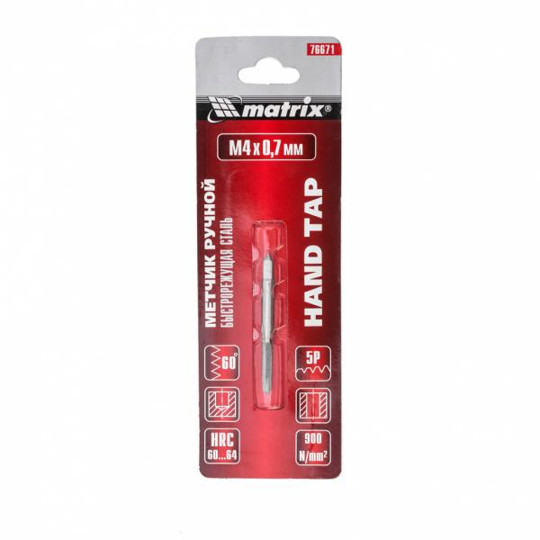 Ручной метчик Matrix 76671, HSS, — резьбонарезной инструмент, который используется для создания резьбы диаметром М4 и шагом 0,7 мм. Оптимален для работы с деталями из твердой стали прочностью до 900 Н/мм2. Нарезает резьбу за один проход. Метчик устанавливается на метчикодержатель с патроном под хвостовик 3,5 мм. Будет полезен в слесарной мастерской, а также дома или в гараже.