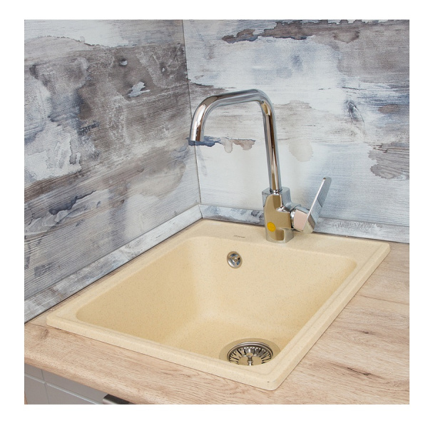 Мойка для кухни RQ21. Ударопрочная поверхность устойчива к высоким температурам. Кроме прочности и эстетичного внешнего вида у каменных моек есть еще одно преимущество – высокое шумоподавление. Звук падающей струи и погружающейся посуды в кварцевой мойке гораздо тише, нежели в стальной модели.