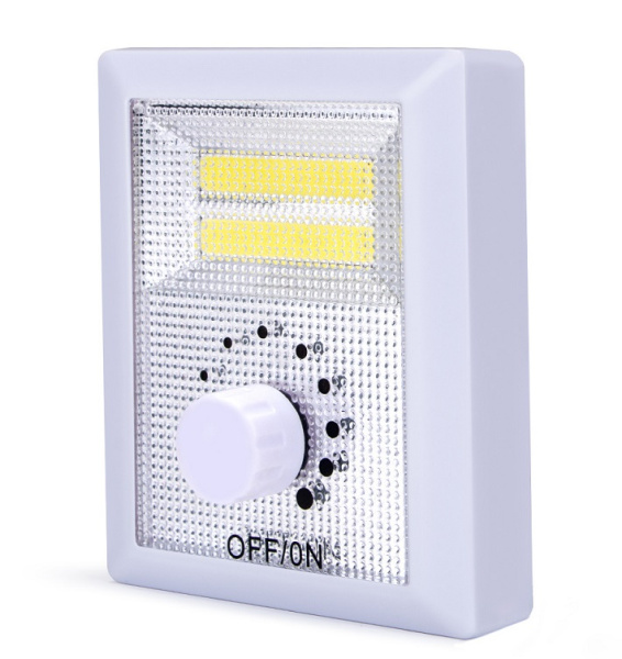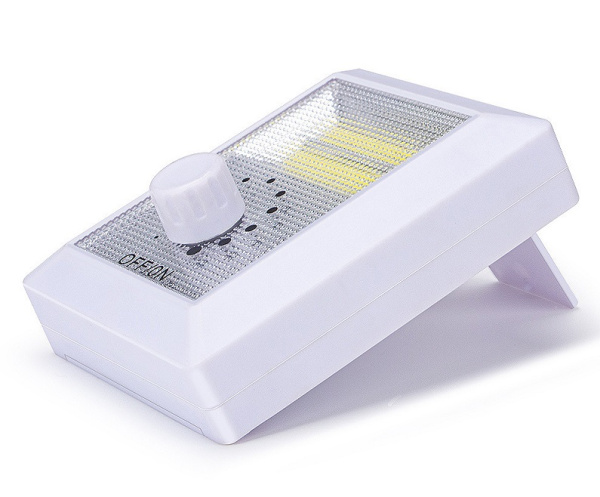 Светильник-выключатель KL-1802 с подсветкой предназначен для включения и выключения искусственного освещения в помещении и на улице. Цвет корпуса светильника-выключателя: белый с двумя жёлтыми вставками в центре корпуса. Клавиша светильника -выключателя оснащена индикатором подсветки для удобства определения его месторасположения в темноте. Можно крепить к поверхности с помощью встроенных магнитов на задней панели или ставить на горизонтальную поверхность с помощью встроенной пластмассовой подставки. Имеется встроенный регулятор яркости на передней панели светильника и встроенный отсек для 3-х батареек.