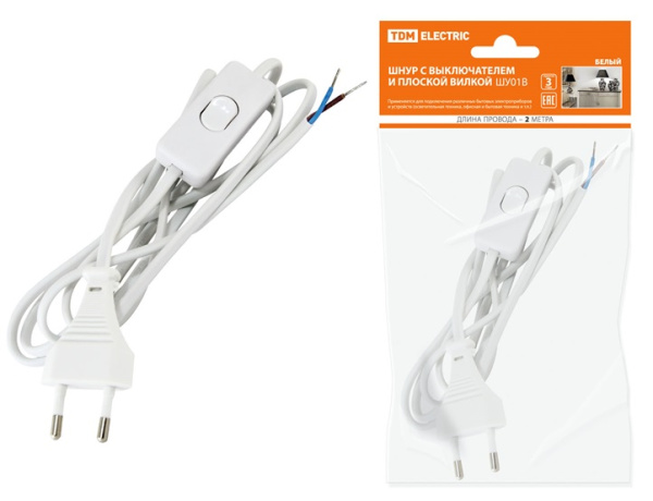 Шнур ШУ03В с выключателем и плоской вилкой TDM Electric для использования потребителями в бытовых целях – подключение бытовых приборов, осветительной техники (настольных ламп, бра, светильников и т. д) Применение: жилые помещения (дома, квартиры), объекты коммерческой недвижимости (офисы, торговые центры и т. д). Выключатель для удобства эксплуатации электроприбора. Простота подключения, не требующая специальных навыков. Вилка подходит как к современным, так и к устаревшим розеткам. Материалы: шнур выполнен из провода ШВВП сечением 0.75 мм2. Корпус из АБС-пластика.