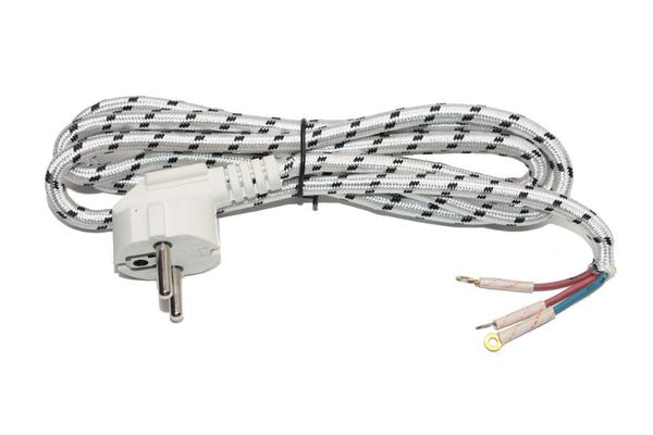 Шнур сетевой с заземлением для утюга. Длина 1,4м. Кабель ШРО 3х0,75, с одной стороны имеет армированную вилку, другой конец зачищен и облужен. Предназначены для работы с любыми электроприборами суммарной мощностью не более 1200 Вт, чаще всего используется с нагревательными приборами (утюг, самовар), т.к. внеШНУР шнюю оболочку кабеля дополнительно покрывает льняная оплетка.