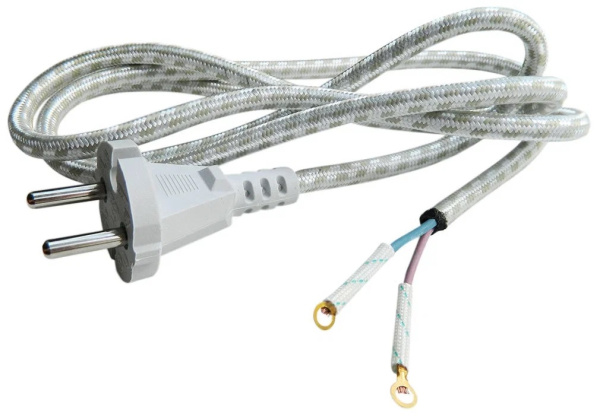 Шнур сетевой для утюга. Длина 2,2м. Кабель ШРО 2х0,75, с одной стороны имеет армированную вилку, другой конец зачищен и облужен. Предназначены для работы с любыми электроприборами суммарной мощностью не более 1200 Вт, чаще всего используется с нагревательными приборами (утюг, самовар), т.к. внешнюю оболочку кабеля дополнительно покрывает льняная оплетка.