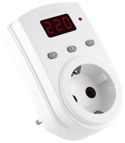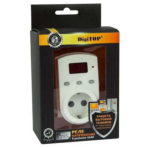 DigiTOP Vp-16AS - устройство защиты, которое постоянно анализирует напряжение в сети и в случае выхода напряжения за установленные пределы происходит аварийное отключение подключенных приборов. Для этого необходимо установить необходимые верхний и нижний пределы напряжения и время, через которое реле подключит включенную в него бытовую технику, после нормализации напряжения. Задержка на включение необходима для холодильников, кондиционеров, для которых неприемлемы кратковременные отключения питания. Устройство имеет полностью цифровое управление и цифровой дисплей. Устанавливаются в розетку. Коммутация нагрузки осуществляется электромагнитным реле. Допустимые пределы отключения и время задержки включения устанавливаются пользователем с помощью кнопок. Значения сохраняются в энергонезависимой памяти.